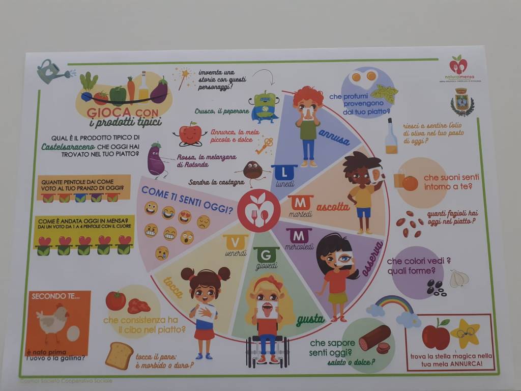 Ieri a scuola sono state distribuite le nostre tovagliette educative che riassumono, graficamente e attraverso attività creative e ludiche, il progetto NaturalMensa che nasce da un atto di indirizzo dell’amministrazione comunale di Castelsaraceno finalizzato a garantire un servizio di refezione scolastica innovativo e lungimirante e soprattutto ad avere ricadute ottimali anche sulla comunità locale attraverso azioni che escono fuori dalle mura dell’istituzione scolastica e coinvolgono l’intero borgo.